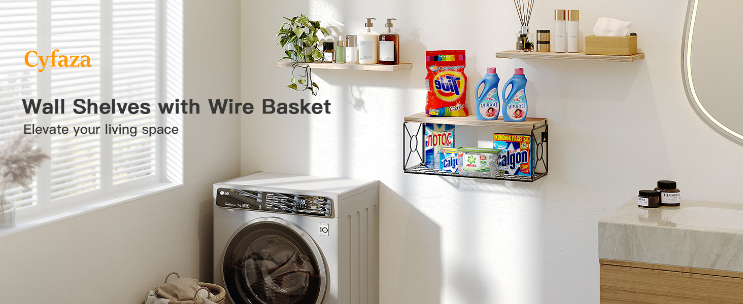 Étagères de Salle de Bain Cyfaza au-dessus des Toilettes avec Panier de Rangement, Étagères Flottantes Murales pour l'Organisation de la Maison et la Décoration Murale, Étagères pour Salle de Bain/Cuisine/Salle de Séjour – Bois Naturel