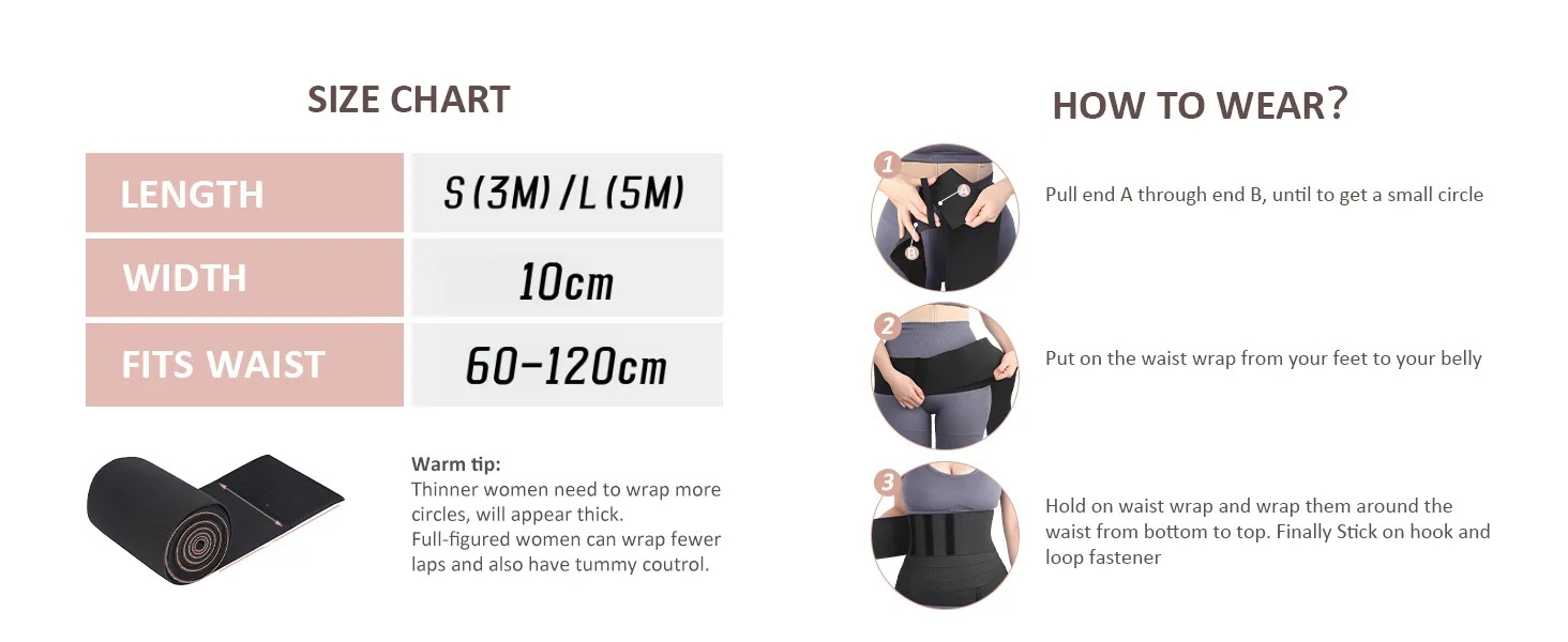 Taille Unique : Notre ceinture abdominale est conçue pour s'adapter à tous les types de morphologies grâce à sa taille unique convenant aux tours de taille de 60 à 120 cm. Mesurant 3/5 m de longueur et 10 cm de largeur, cette bande enveloppante offre une grande polyvalence pour affiner votre taille, vous permettant d'ajuster la tension selon votre préférence pour un confort optimal. Conseils utiles : Les femmes plus minces devront enrouler plus de tours, ce qui donnera un aspect plus épais, tandis que les femmes aux formes généreuses peuvent enrouler moins de boucles tout en maintenant le contrôle du ventre.