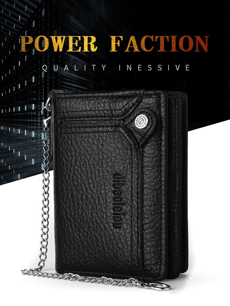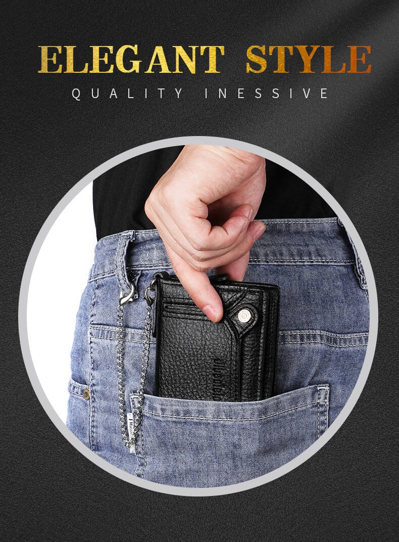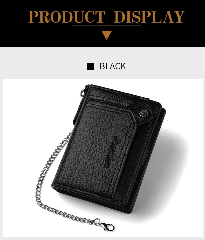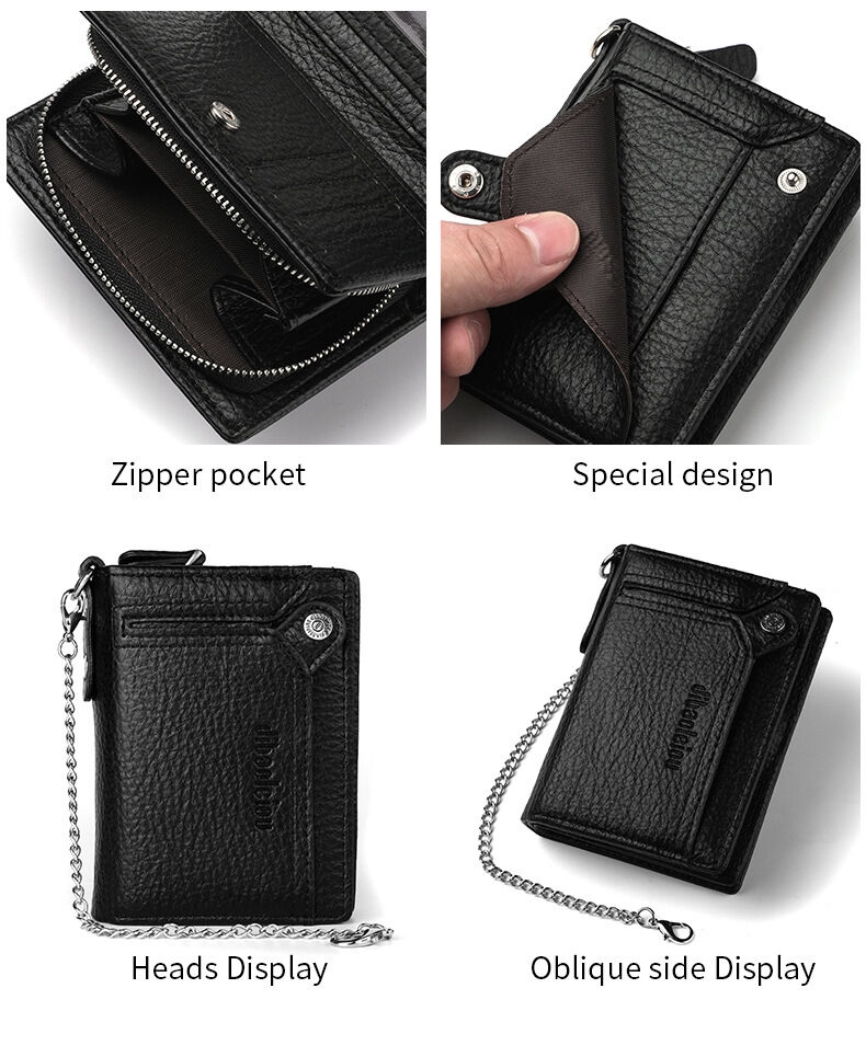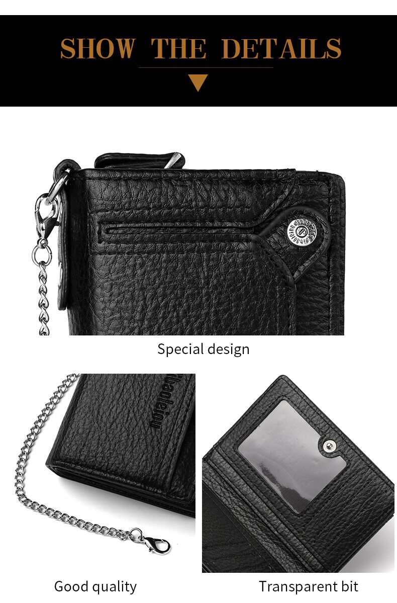 [Security, Privacy, Safety] shielding prevents unauthorized scanning of personal information, protecting you from electronic theft and keeping you safe anytime, anywhere. The leather men's wallet features an anti-theft chain to prevent theft; the chain can be removed via a clasp. Lightweight and slim design.