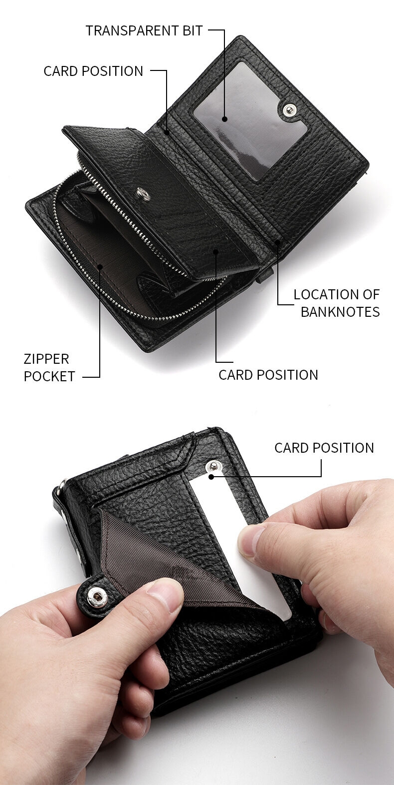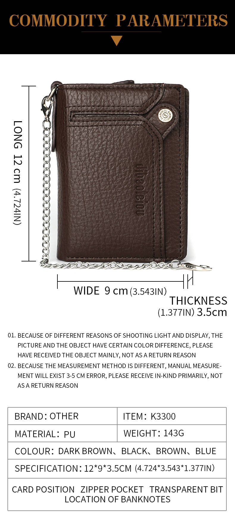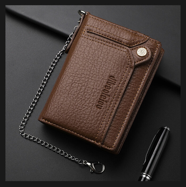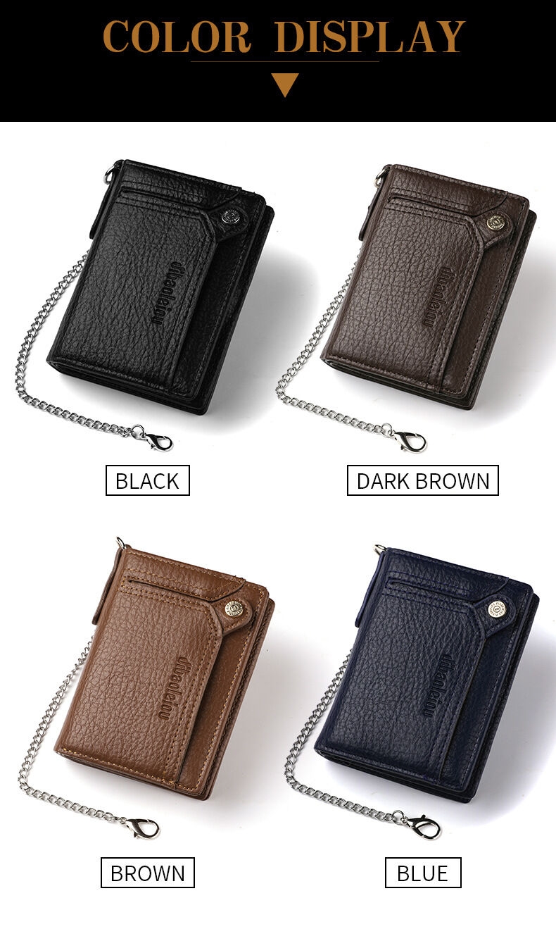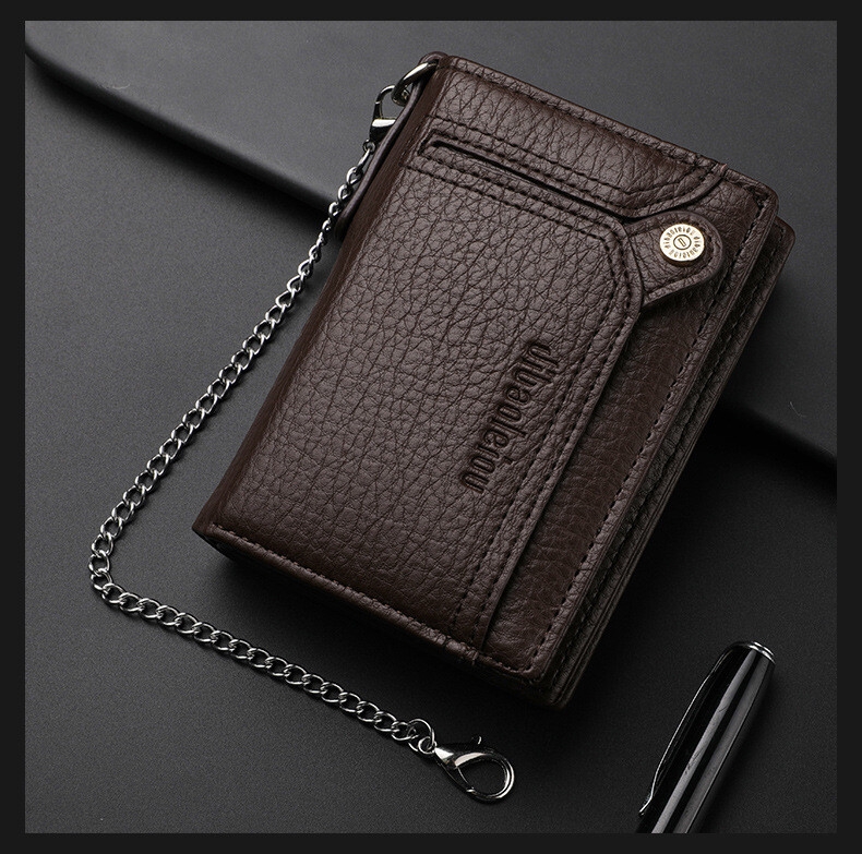 [Security, Privacy, Safety] shielding prevents unauthorized scanning of personal information, protecting you from electronic theft and keeping you safe anytime, anywhere. The leather men's wallet features an anti-theft chain to prevent theft; the chain can be removed via a clasp. Lightweight and slim design.