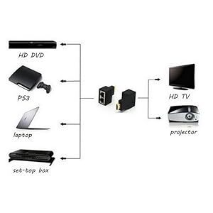 1. Ce type d'extension HDMI CAT-5e/6 permet d'étendre la portée de votre téléviseur HD jusqu'à 30 mètres (100 pieds) à l'aide de deux câbles CAT-5e/6 et prend en charge une résolution jusqu'à 1080p. 2. Outre le fait de s'affranchir de la limite de longueur de transmission des câbles HDMI, le CAT-5e/6 accroît la flexibilité et la facilité de connexion.