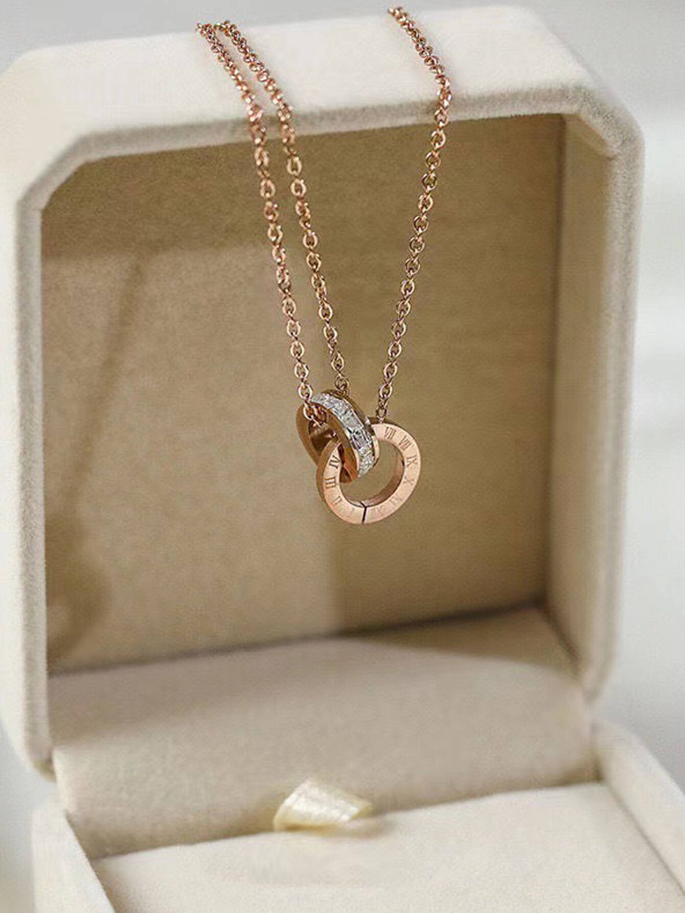 Le bracelet assorti est une fine chaînette, généralement en acier inoxydable ou titane de couleur or rose. Il présente un pendentif composé de deux anneaux entrelacés : l'un orné de cristaux de zirconium et l'autre gravé de chiffres romains.