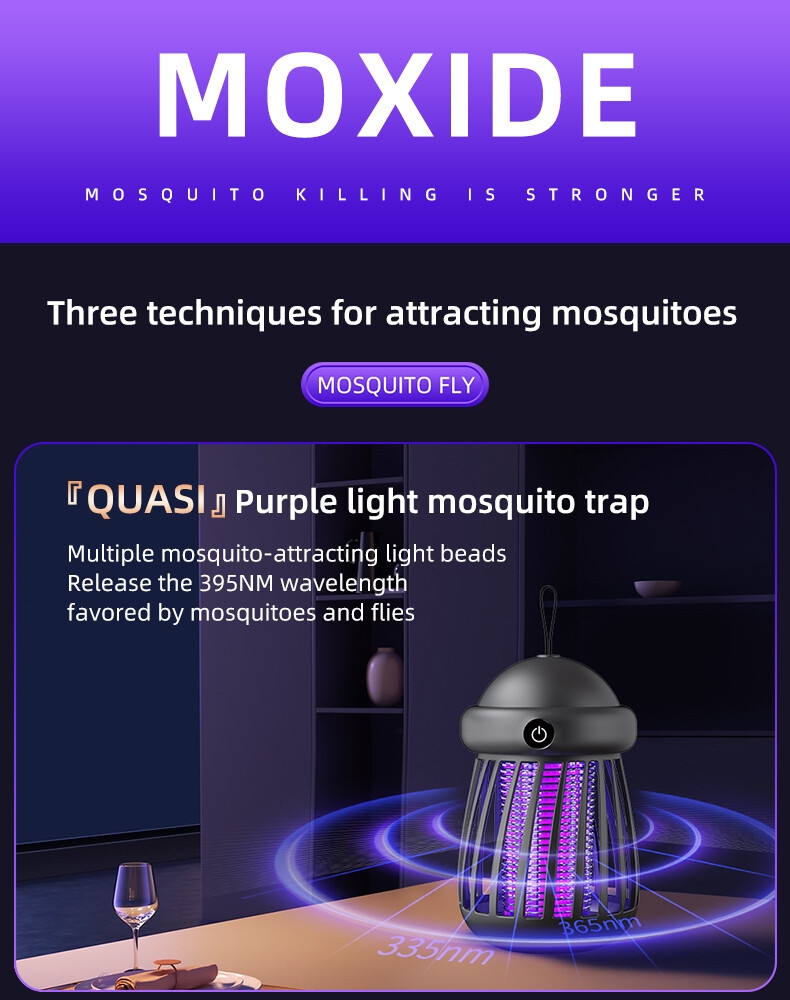 ✔ Élimination des moustiques par électrocution pure, sans résidus chimiques, sans danger pour les mères, les bébés et les animaux domestiques.