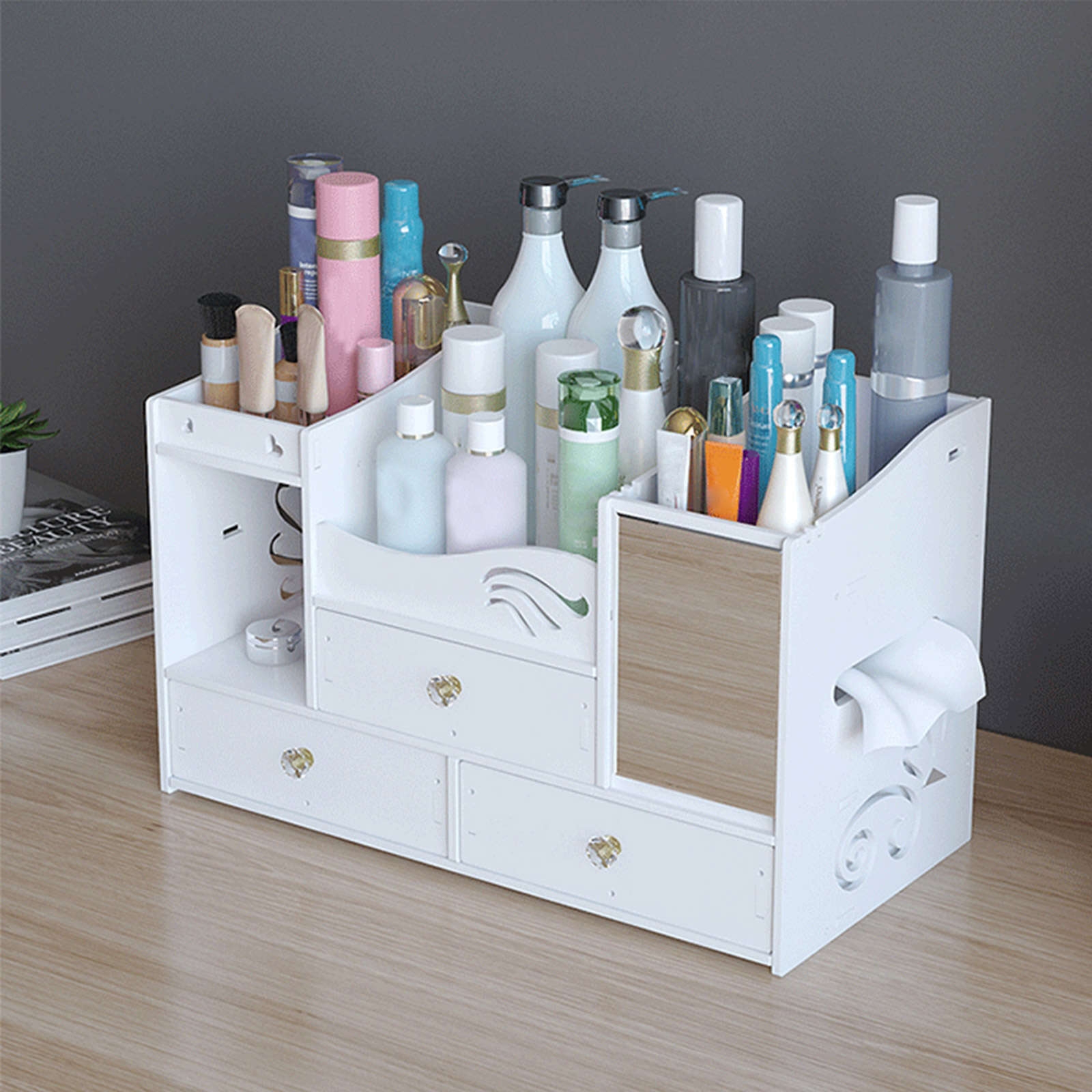 ❤ TIROIRS PROFONDS : Notre organiseur de maquillage est doté de tiroirs profonds qui coulissent facilement pour ranger vos affaires. Le miroir réglable et la boîte à mouchoirs invisible sont pratiques à utiliser.