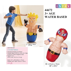 Sac gonflable 3D Bop Intex 44672, idéal pour une utilisation en intérieur et en extérieur. Le mannequin de frappe conserve sa stabilité grâce à la pression de l'eau au fond du jouet. Il est destiné uniquement aux surfaces solides.