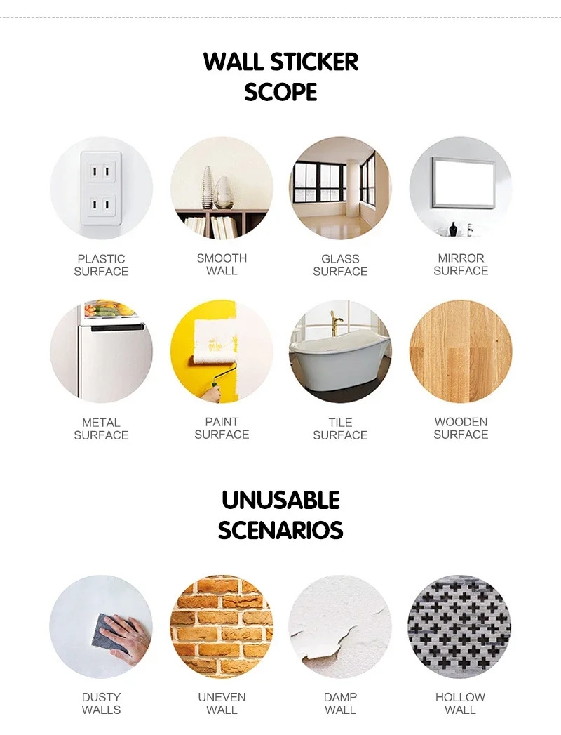 Caractéristiques: 1.Stickers muraux réutilisables et repositionnables, faciles à utiliser. 2.Écologique, imperméable, amovible et auto-adhésif. 3.Facile à appliquer et à retirer sans laisser de résidus collants.