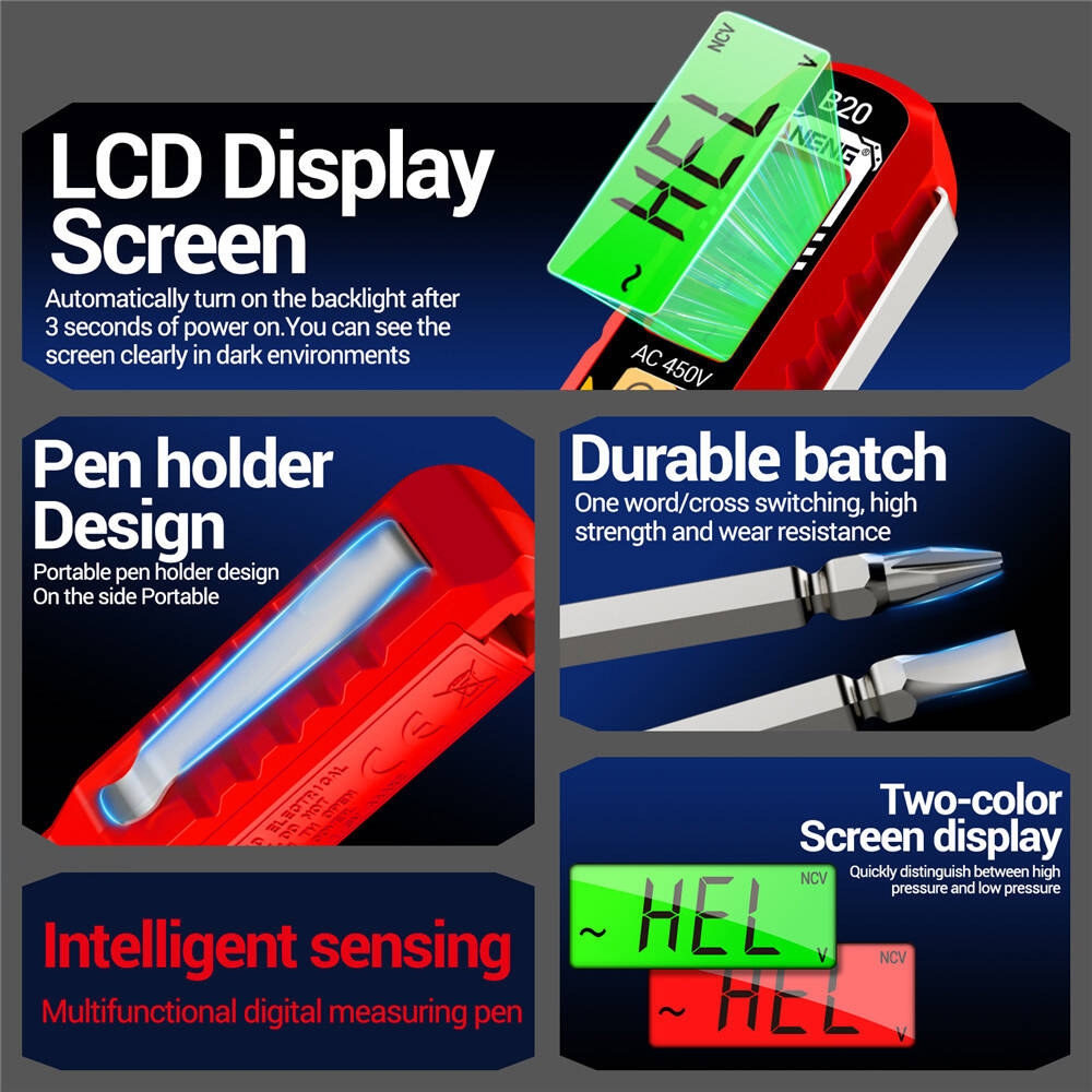 1. Écran LCD rétroéclairé bicolore : Affiche les données de mesure. Affichage bicolore intégré : rouge pour haute tension et vert pour basse tension. 2. Lampe torche : Maintenez le bouton S enfoncé pendant 3 secondes pour allumer la lampe torche, ce qui vous permet de visualiser clairement l’emplacement de l’objet testé, même dans l’obscurité.