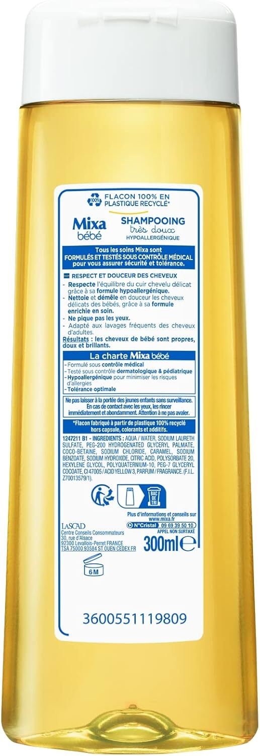 Testé sous contrôle dermatologique et ophtalmologique, ce shampooing est hypoallergénique pour minimiser les risques d'allergie. Au-delà de sa performance de nettoyage, il laisse sur la chevelure de bébé ce parfum de "propre" si caractéristique de Mixa, une odeur douce et rassurante qui prolonge le plaisir du soin bien après le séchage. Sa formule pure sans ingrédients controversés respecte la santé de votre enfant.