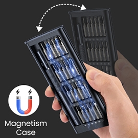 | Embouts en Acier Premium Fabriqués en acier de haute qualité avec une dureté > HRC65°, ces embouts résistent à l'usure, l'oxydation et la corrosion pour une performance durable. | Pointe Magnétisable La pointe magnétisable puissante attrape et maintient facilement les vis, vous aidant à manipuler toutes les vis minuscules. | Étui de Rangement Magnétique Conçu avec une fermeture magnétique, cet étui maintient chaque embout en place, les gardant organisés et évitant les pertes. |