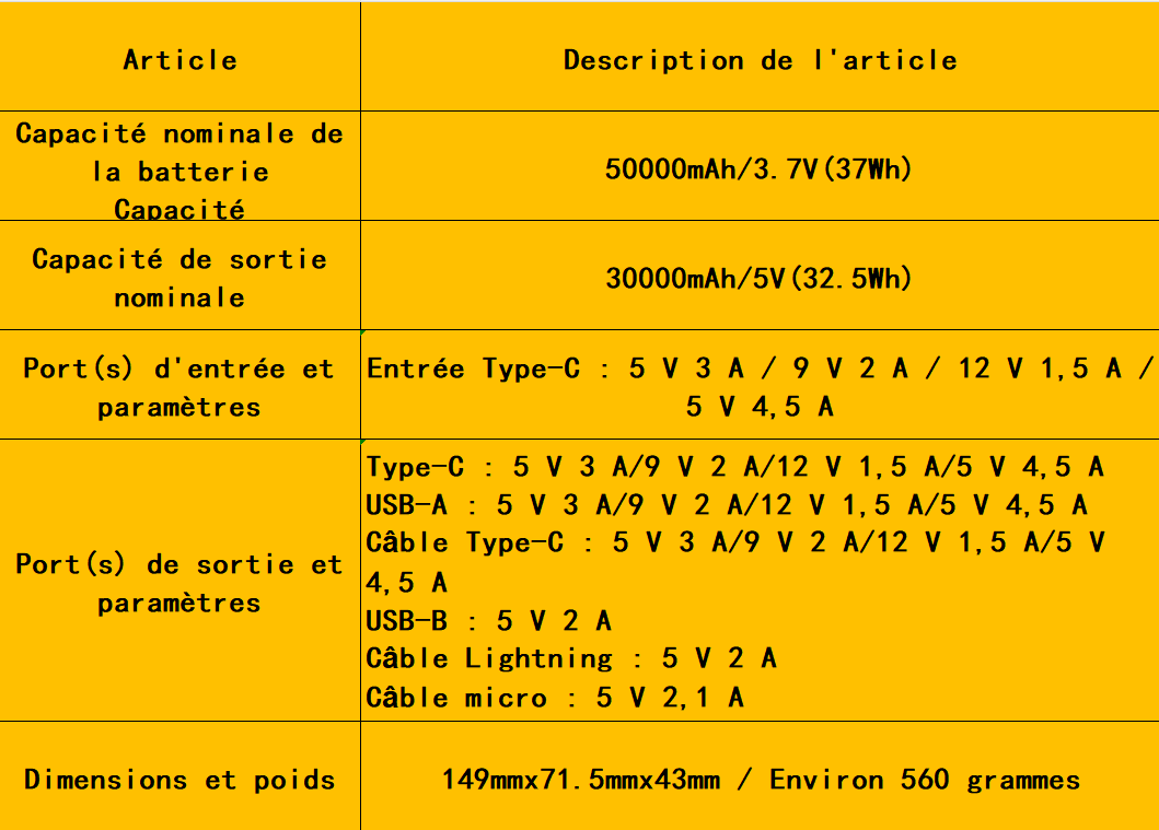 ● Exemple : une batterie externe d'une capacité nominale de 50 000 mAh fournira environ 30 000 à 35 000 mAh de capacité de charge utilisable pour les appareils (les valeurs réelles varient en fonction de l'appareil et des conditions d'utilisation).