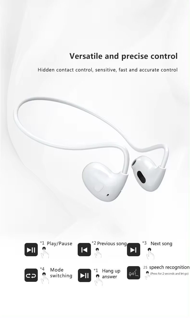 | Spécifications: | 1. La conduction osseuse peut mieux protéger nos oreilles et réduire les bactéries dans les oreilles 2. La transmission de la qualité sonore est plus claire, avec un effet de réduction du bruit 3. La transmission de la puce BT 5.0 est plus stable, fluide et sans délai 4. Les oreilles sont ergonomiques et confortables à porter | |||